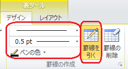 まず表ツール、デザインタブの「罫線を引く」を