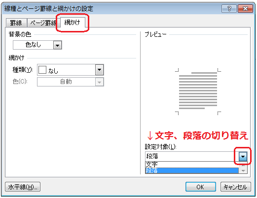 網掛けの設定対象は右下の▼をクリックして