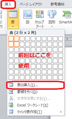 前回迄は表を挿入してから