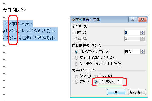 表示されたウィンドウより「文字列を表にする」を選択します。