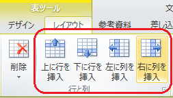 表ツールレイアウトタブの「行と列」グループの