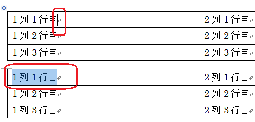 1列1行目でカーソルが点滅と選択