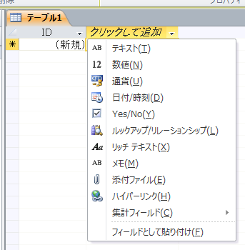 「フィールド名」を付け「データ型」の箱の中をクリック