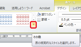 表ツール、デザインタブ、表のスタイルグループには