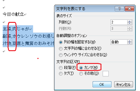 表示されたウィンドウより「文字列を表にする」を選択します。