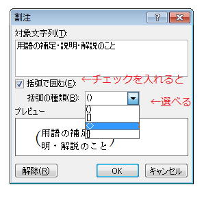 割注ウィンドウの「括弧で囲む」にチェックを入れると